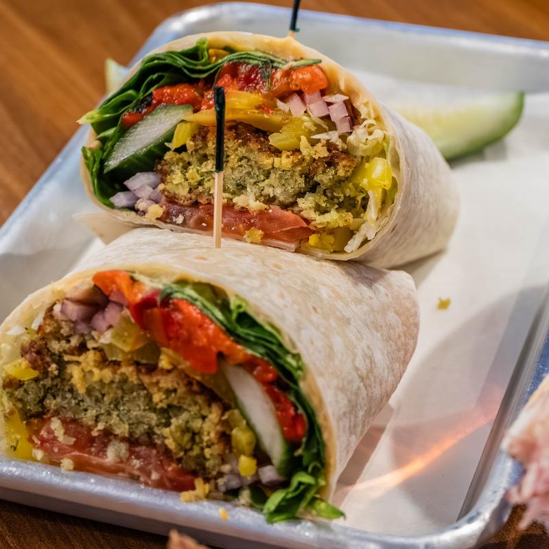 Falafel, hummus, lettuce, spinach, tomato, roasted red peppers, cucumber, red onion, banana peppers