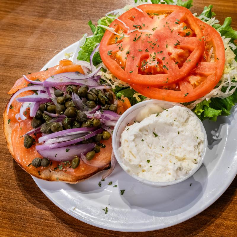 Smoked salmon, cream cheese, lettuce, tomato, onion, capers, choice of bagel